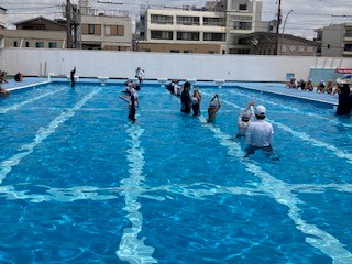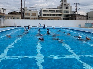 1・2年生のプールの様子です。矢田北小学校のプールカードを使い、何級まで合格できるかをテストしました。水中で歩いたり、クラゲ浮きをしたり、けのびをしたりしました。