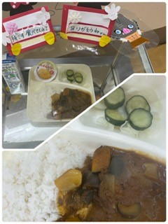 今日の給食は、「夏野菜のカレーライス」「牛乳」「キャベツときゅうりのサラダ」「みかん🍊ゼリー」です。