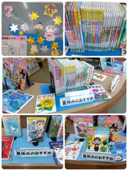 7月の図書室です。「夏休みにおすすめの本」を選び、展示しています。「ひまわり」「あさがお」「かわいい工作」「海底2万マイル」などがあります。・・・