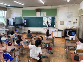 チャレンジのあとは、時計の学習をしました。時間と時刻の違いや、何分後、何分前をさんすうとけいを使って、練習していました。