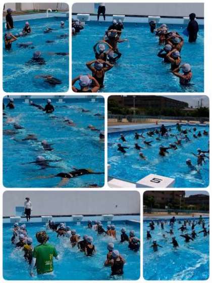 夏休みのプール開放の様子です。みんな元気に水泳の学習に取り組んでいます。水が苦手だった児童もしっかりと潜ることができるようになってきました。