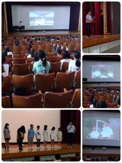 学校長の話の後、全員で黙とうをしました。人権教育主担からの話の後、「広島平和記念式典の様子(昨年度のもの)」のビデオ視聴、矢田7校の児童会・生徒会の集まり:子連協(矢田子どもつながり連絡協議会)による「すみれ島」の朗読劇を鑑賞しました。