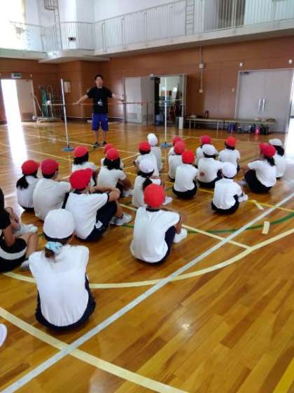 体育館では、5年生が「走り高跳び」の学習をしています。基本的な動きやポイントなどの指示をしっかりと聞いています。