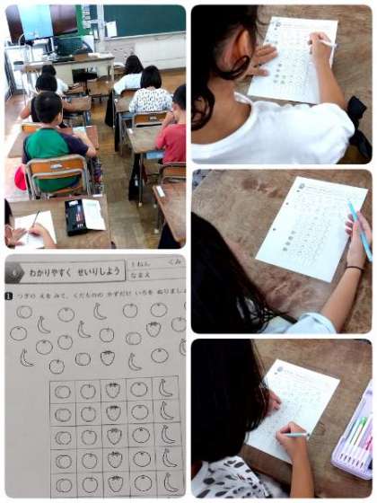 1年生の算数です。「わかりやすく せいりしよう」の学習で、丁寧に色分けをしています。