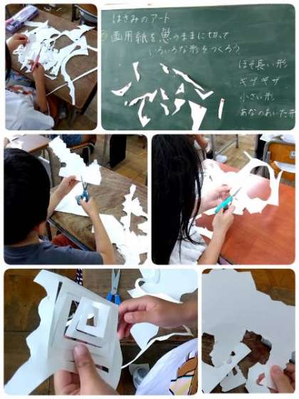 2年生の図工の時間です。画用紙をハサミで思うままに切って、いろいろな形を作っています。細長い形やギザギザな形・・・