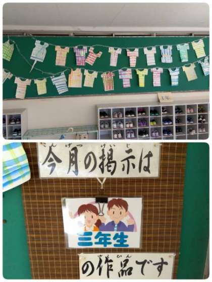 9月の玄関掲示は、3年生が担当しました。物干しざおにカラフルなシャツがたくさん干してあります。