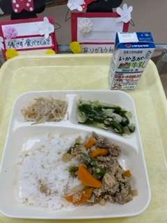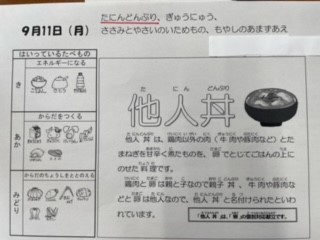 今日の給食は、「他人丼(たにんどんぶり)」「牛乳」「ささみと野菜(やさい)のいためもの」「もやしの甘酢(あまず)あえ」です。