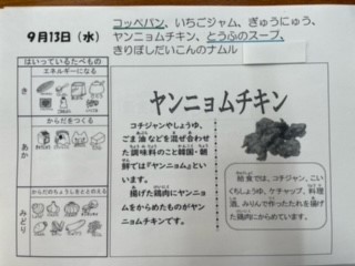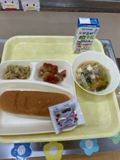 今日の給食は、「コッペパン」「いちごジャム」「牛乳」「ヤンニョムチキン」「とうふのスープ」「きりぼしだいこんのナムル」です。