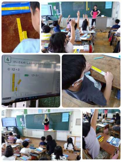1年生の算数の時間です。ブロックを使い、「12+3」の計算の仕方を考えています。みんなしっかりと頑張っています。