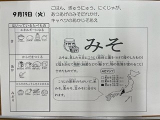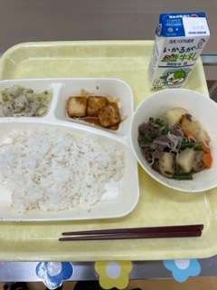 今日の給食は、「ごはん」「牛乳」「にくじゃが」「あつあげのみそだれかけ」「キャベツのあかじそあえ」です。