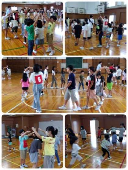 児童集会を体育館で行いました。「瀬戸大橋ゲーム」というゲームです。なかよし班で楽しく交流しています。みんなの笑顔が素敵です。