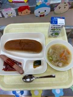 今日の給食は、「こくとうパン」「牛乳」「ウインナーのケチャップ