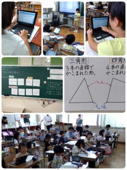 2年生の研究授業を行いました。算数科の単元「長方形と正方形(さんかくやしかくの形をしらべよう)」の学習です。めあてを「三角形や四角形はどんな形か考えよう」とし、学習しました。