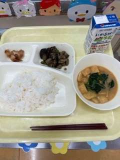 今日の給食は、「ごはん」「牛乳」「けいにくのてりやき」「かぼちゃのみそしる」「なすのそぼろいため」です。