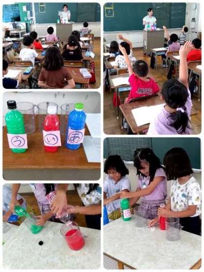 1年生の算数「どちらがおおい」の学習です。3つのペットボトルに入った水の量について、どれが多いか予想をしました。同じ大きさのコップに入れ替えて、比べました。予想はあっていましたか?