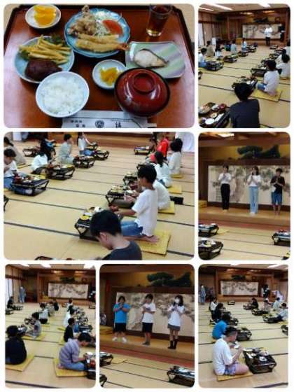 夕食の時間です。ハンバーグやエビフライ等、子どもたちも大好きなメニューです。おかわりもして、しっかり残さず食べました。