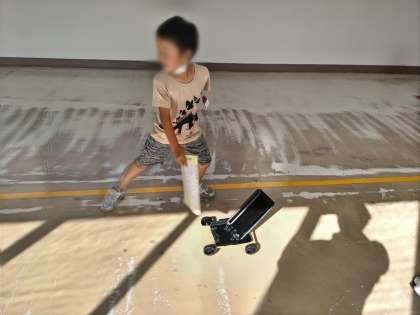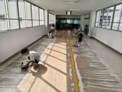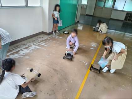 2年生の生活の授業です。少しでもたくさん早く進むようにと、一人ひとりが熱心に考えながら動くおもちゃを作っていました。廊下に出て、速く走るかを下敷きを使ってあおいでいる姿が、とても楽しそうでした。
