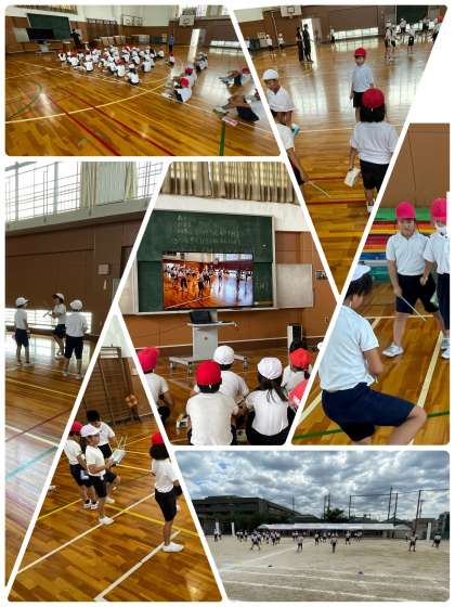 3・4年生の団体演技の練習の様子です。暑さ対策も兼ねて体育館で動きを確認し、時にはグループに分かれて4年生が3年生に向けてポイントを教える場面もありました。自分たちがどのように踊れているのか、撮影された動画を振り返り、本番に向けての意欲を高めていました。今日は運動場で、本番と同じ形で踊る練習もしました。(10月6日 記事)