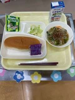 今日の給食は、「コッペパン」「ぎゅうにゅう」「タンタンめん」「あっさりキャベツ」「まっちゃだいず」「ブルーベリージャム」です。