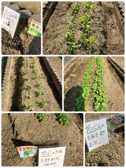 なかよし学習園では、なにわの伝統野菜:田辺大根や天王寺かぶらを育てています。水やりを続けていると、芽がでました。元気に大きく育ってくださいね。