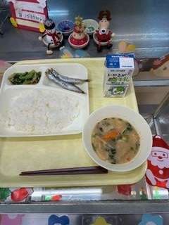 今日の給食は、「ごはん」「ぎゅうにゅう」「やきししゃも」「みそしる」「こまつなのいためもの」です。
