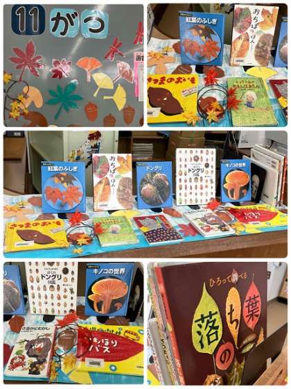 11月の図書室です。「秋」をテーマに本を選び、展示しています。「おちばの本」「キノコの世界」「紅葉のふしぎ」「どんぐり」などがあります。・・・