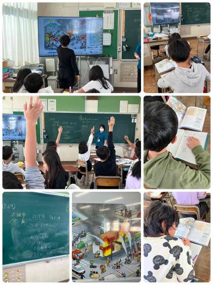 3年生の社会科の授業です。「消防署の仕事」について、学習しました。火事の現場でどのような人々が動いているのか、教科書の挿絵を見ながら考えました。(11月22日 記事)