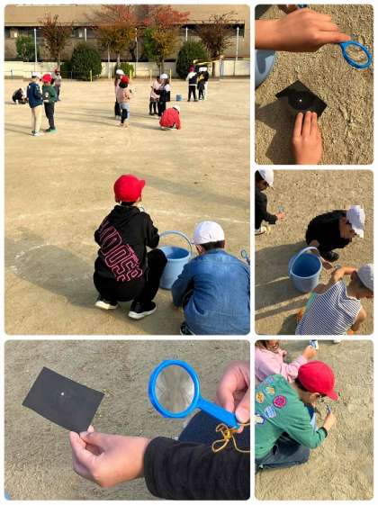 3年生が運動場で実験をしています。虫メガネで太陽の光を集めて黒い紙にあてています。どうなるでしょうか。