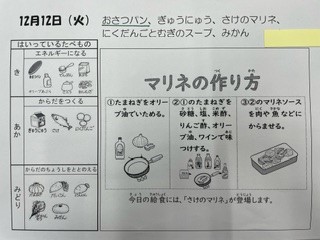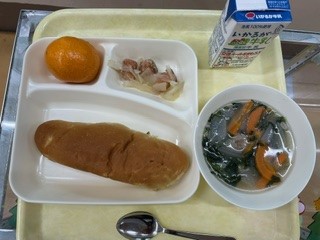 今日の給食は、「おさつパン」「ぎゅうにゅう」「さけのマリネ」