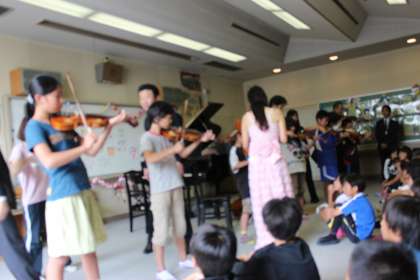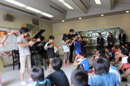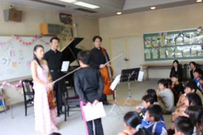 すごいアーティストたちが来てくれました。ヴァイオリンの吉田恭子さんとチェロの渡部玄一さんとピアノの白石光隆さんは、リサイタルやオーケストラでご活躍されていて、テレビでもお馴染みの方々です。今日は音楽室で4・5・6年生が、目の前での生の演奏の迫力に魅せられました。数名の児童は、ヴァイオリンの演奏体験もさせていただきました。