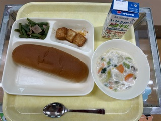 今日の献立は、「こくとうパン」「ぎゅうにゅう」「はくさいのクリームに」「あつあげのピリからじょうゆかけ」「ぶたにくとさんどまめの オイスターソースいため」です。