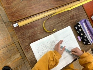 2年生の算数では、両手を広げた長さをどのように測ったらいいかを考えました。ものさしをつぎたして測ったり、1mものさしを使ったりして「すごく長い!」「強そう!」など、喜ぶ声も聞かれ、楽しく学習することができました。