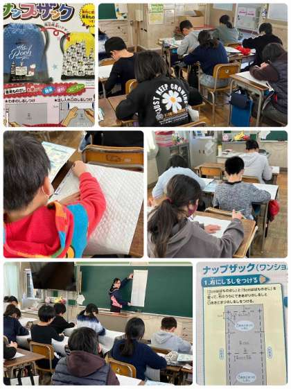 5年生の家庭科の授業です。「ナップザック」の製作を始めました。「布にしるしをつける」作業を丁寧におこなっています。設計図が間違っているとしっかりしたものが作れません。集中していますね。