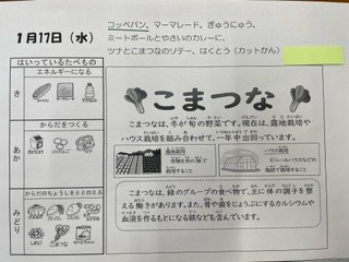 こまつなは、緑のグループの食べ物で、主に体の調子を整える働きが あります。また、骨や歯をじょうぶにするカルシウムや血液を作るもとになる鉄なども含んでいます。