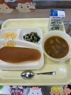 今日の給食は、「コッペパン」「マーマレード」「ぎゅうにゅう」 「ミートボールとやさいのカレーに」「ツナとこまつなのソテー」 「はくとう(カットかん)」です。