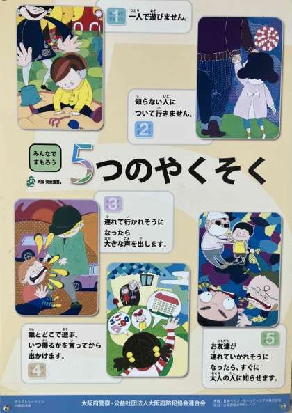 大阪府警より「5つのやくそく」の周知がきています。もう一度確認して、安全に過ごすようにしましょう。