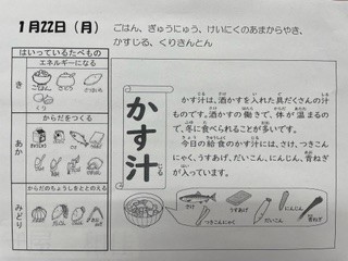 今日の給食のかす汁には、さけ、つきこんにゃく、うすあげ、だいこん、にんじん、青ねぎが入っています。