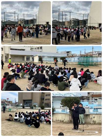不審者が侵入してきたことを想定した避難訓練(防犯)を行いました。110番通報と教職員での対応、児童を安全な場所への移動(安全確保)をする訓練です。東住吉警察の方より、「もしものことがあれば、先生の話を静かにしっかりと聞くことが大切です。」とのお話を聞きました。子どもたちは、先生の指示をしっかり聞き、すばやく避難することができました。(1月23日 記事)