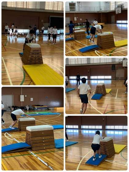 4年生の体育の授業です。とび箱の「閉脚跳び」や「台上前転」をしています。