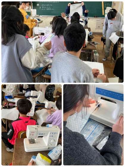 5年生の家庭科です。「ナップザック」作りでミシンを使っています。待ち針で止め、まっすぐに縫えるように慎重にミシンを動かしています。