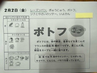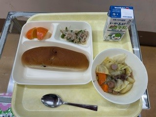 今日の給食は、「レーズンパン」「牛乳」「ポトフ」「ツナと野菜の