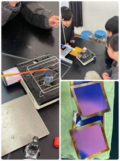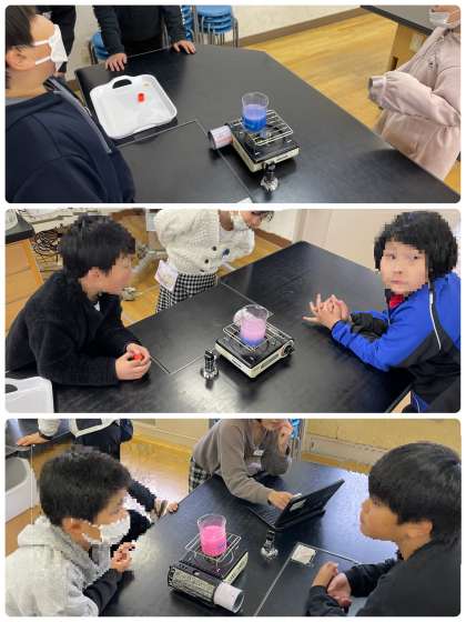 4年生では、理科で「もののあたたまり方」について学習しています。様々な実験を通して、金属は熱しているところから均等にあたたまっていくのに対して、水や空気は、熱したところからけむりのように上に上がってから全体があたたまることに気づきました。