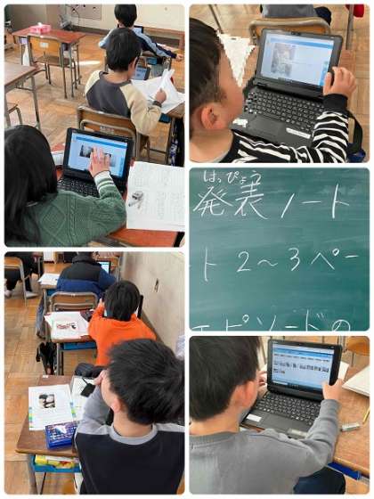 2年生の教室では、タブレットで発表用の原稿を作成していました。きちんとまとめられるでしょうか。発表もがんばってくださいね。