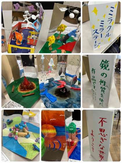 5年生の図画工作の作品です。「ミラクル ミラー ステージ」といい、鏡の性質を使った作品です。どの作品も工夫があり、不思議な世界へ迷いこんでしまいます。