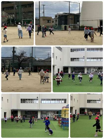 休み時間の様子です。運動場では、サッカーやドッジボール、一輪車に挑戦している子どももいます。寒いですが、今日も矢田北小学校の子どもたちは、元気いっぱいです。