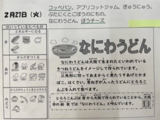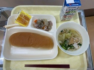 今日の給食は、「コッペパン」「アプリコットジャム」「牛乳」「豚肉とごぼうの煮物」「なにわうどん」「棒チーズ」です。