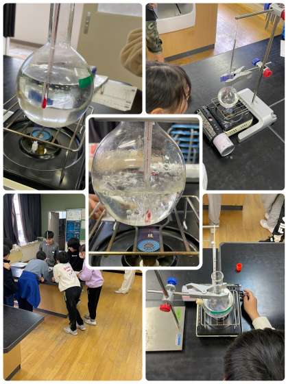 4年生は、理科で「水のすがた」について学習しています。実験では、水を熱することによってどのような変化があるのか観察し、温度や水の様子についてこまかく記録しました。100度の辺りになると、それ以上温度が上がらないことに気づいていました。