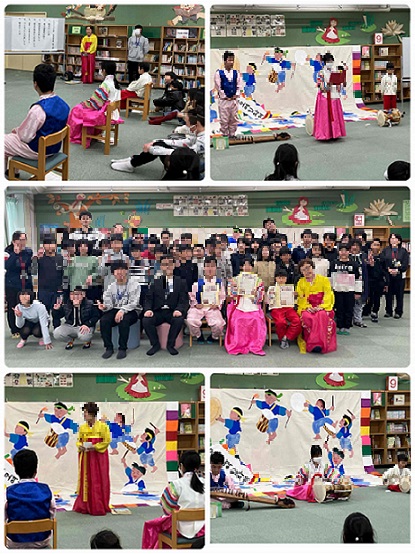 民族学級修了式を行いました。担任の先生やソンセン二ムにお祝いの言葉をいただいた後、参加児童で「アリラン」を演奏しました。修了式の後、応援の児童とともに全員で記念撮影をしました。