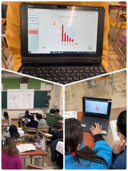 3年生は、算数科で棒グラフの書き方について学習しました。今回は一人一台タブレット端末を使って、棒グラフを作成しました。表にある情報を使い、正確に棒グラフに表すことができていました。