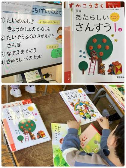 1年生は、新しい教科書の確認をしています。名前が書いているか、机のどの場所に置くのか、一つ一つ覚えていきます。